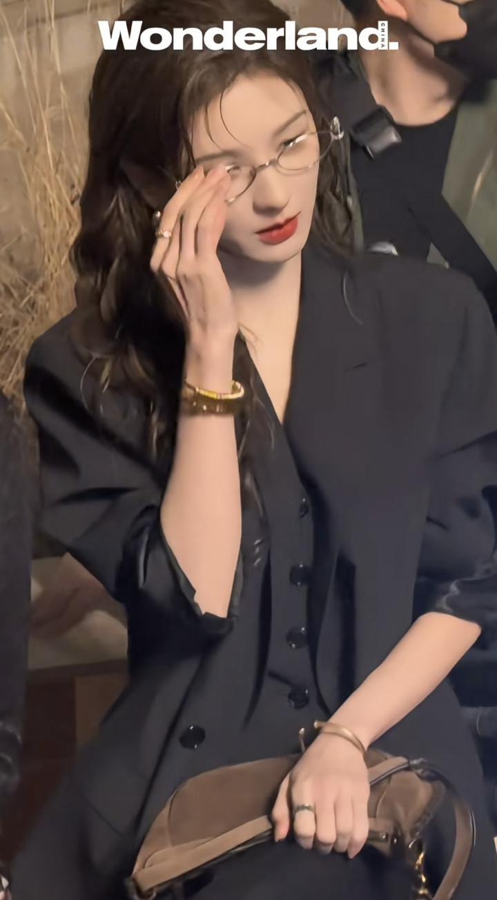 张予曦穿了一套黑色西装,比起裙子,她好像更适合这种衣服,她还搭配了一个金边的框架眼镜,特别像职场的女强人,整个人的气场真的太A了。